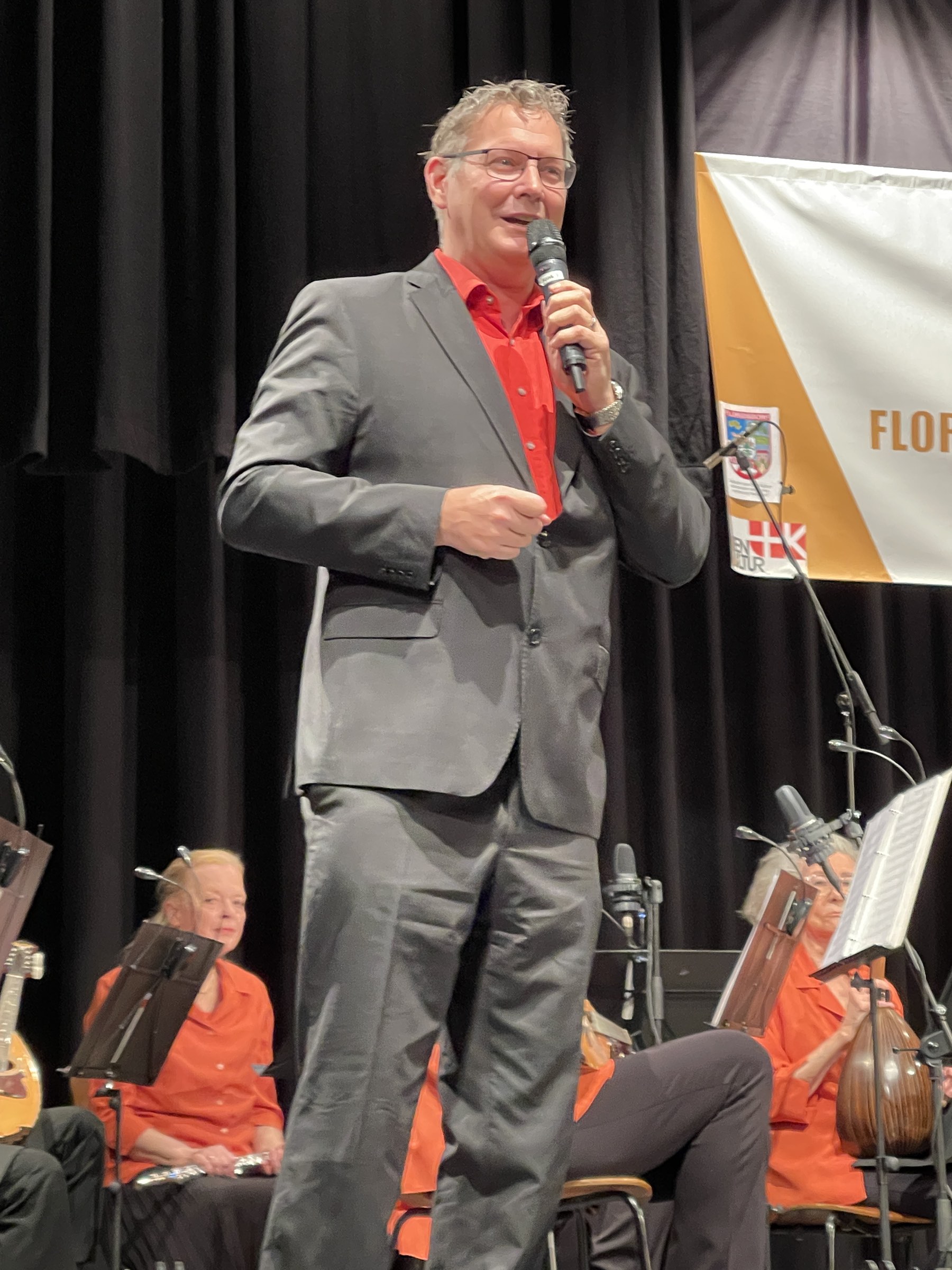 Zu Beginn des 2. Teils hatte der Margarethener Männerchor seinen Auftritt. Mit dem stimmungsvollen Lied „Is scho still uman See“ von Günther Mittergradnegger sang sich der Chor in die Herzen der Zuhörer, ebenso mit dem Ohrwurm „La Montanara“ von Toni Ortelli. Fröhlicher wurde es mit „I gfrei mi auf die Samstanacht“, einem Lied aus der Steiermark. Der Männerchor wurde mit viel Beifall belohnt. Die Hausmusi Reitbauer erfreute nun die Zuhörer mit dem „Steierlander“, einer Volksweise von Florian Michlbauer. Danach hatte die Harfenistin Stefanie Bramböck ihren Soloauftritt. Andächtig lauschte das Publikum den Harfenklängen. Zuerst wurde der „Höhlensteiner Marsch“ von Sepp Haidacher dargeboten und danach ein Walzer von Sepp Hager. Abschließend erheiterte Stefanie Bramböck als Sängerin mit „Da Lugg und da Karl“, einem Lied aus Tirol, die Zuhörer. Ihr Lohn war begeisterter Applaus. Danach gehörte die Bühne wieder den Floridsdorfer Spatzen. Ein Ohrwurm nach dem anderen wurde geboten. Das „Harry Lime Thema“ von Anton Karas, „Wien bleibt Wien“ von Johann Schrammel, die „Wiener Sekt Polka“ von Rudi Müntner und „Wien wird schön erst bei Nacht“ von Robert Stolz. Man merkte die Freude am gemeinsamen Musizieren und so wurde jedes Stück zu einem Erlebnis. Das Publikum bedankte sich mit begeistertem Applaus. Ihren letzten Auftritt hatte die Hausmusi Reitbauer mit der wunderschönen Volksweise „Es woar amol am Abend spat“. Es gab großen Beifall. Zum Abschluss traten das Orchester und die Chöre gemeinsam auf. Sie erfreuten und begeisterten die Zuhörerinnen und Zuhörer mit der „Annen-Polka“ von Johann Strauss und „Im Prater blüh´n wieder die Bäume“ von Robert Stolz.