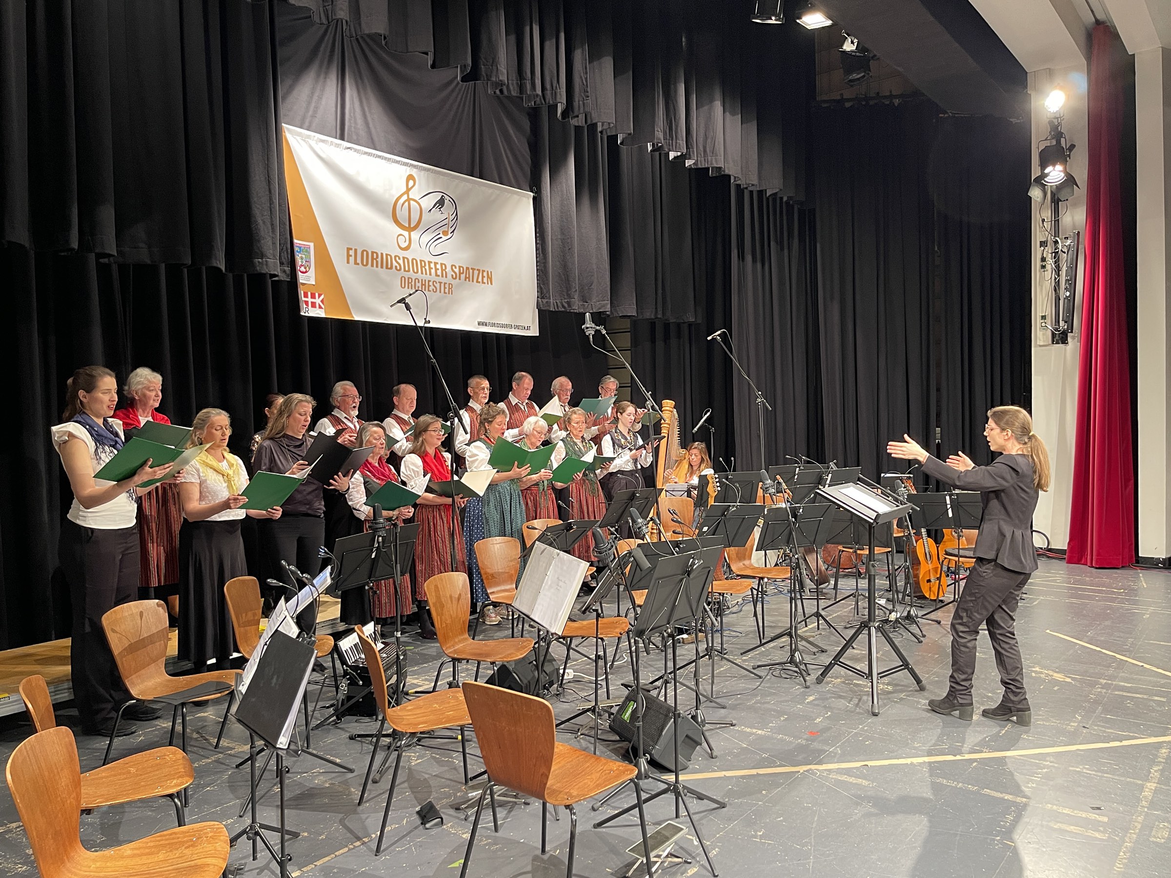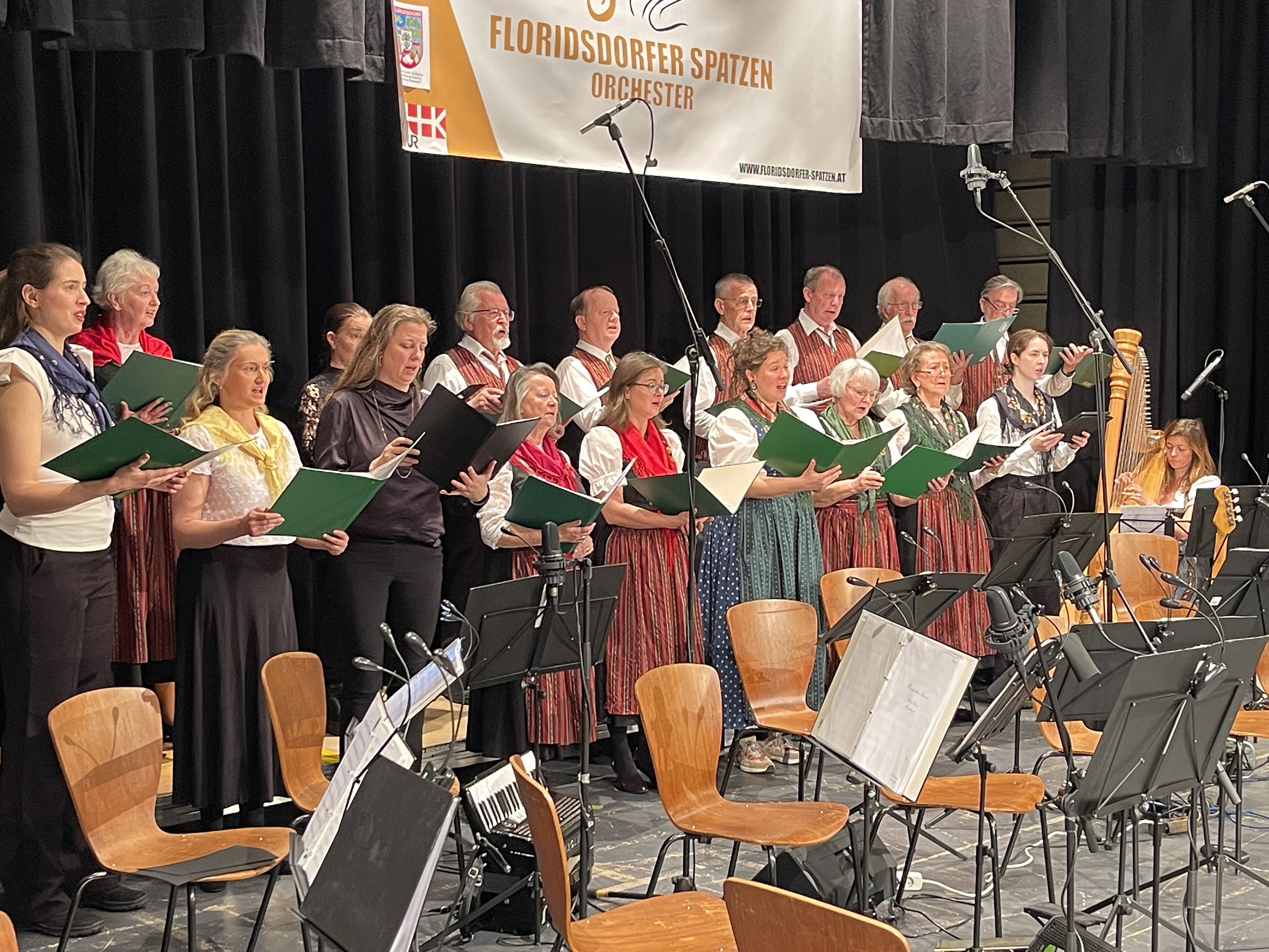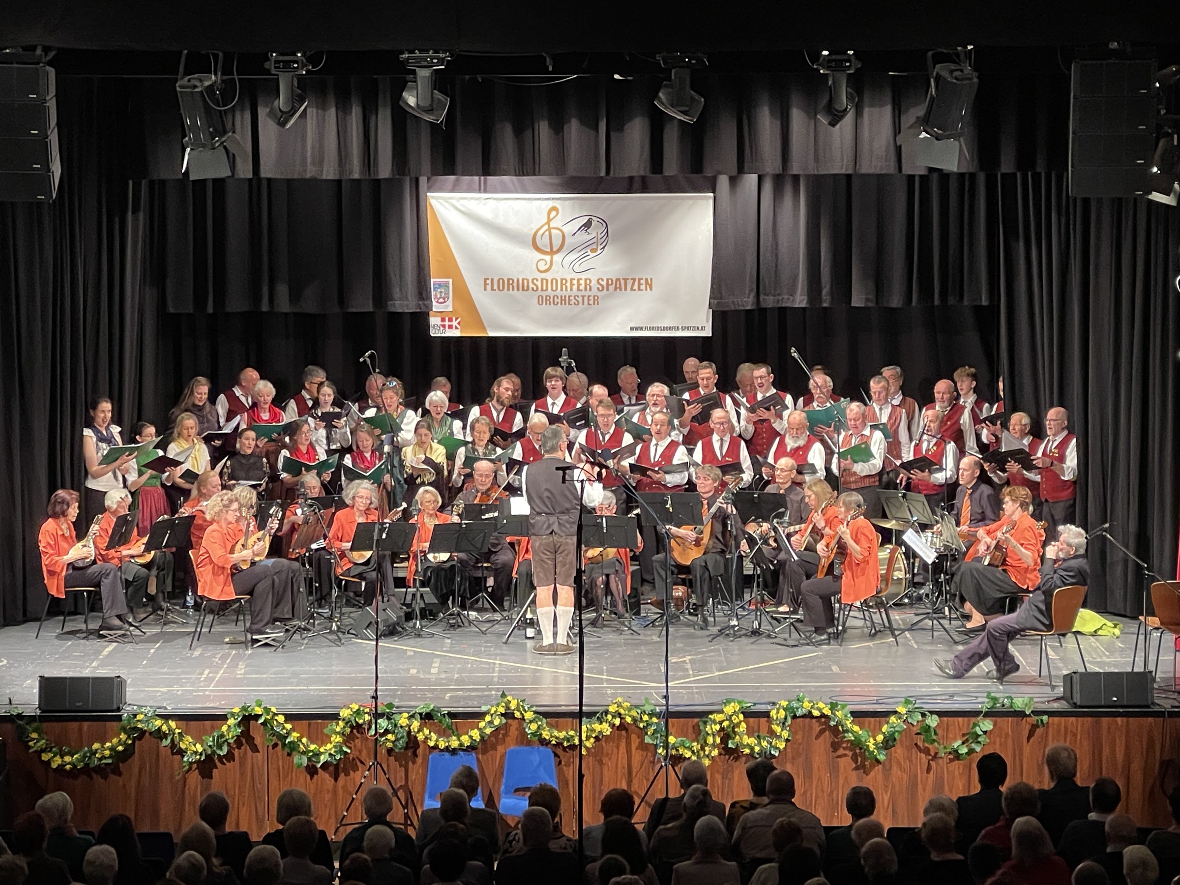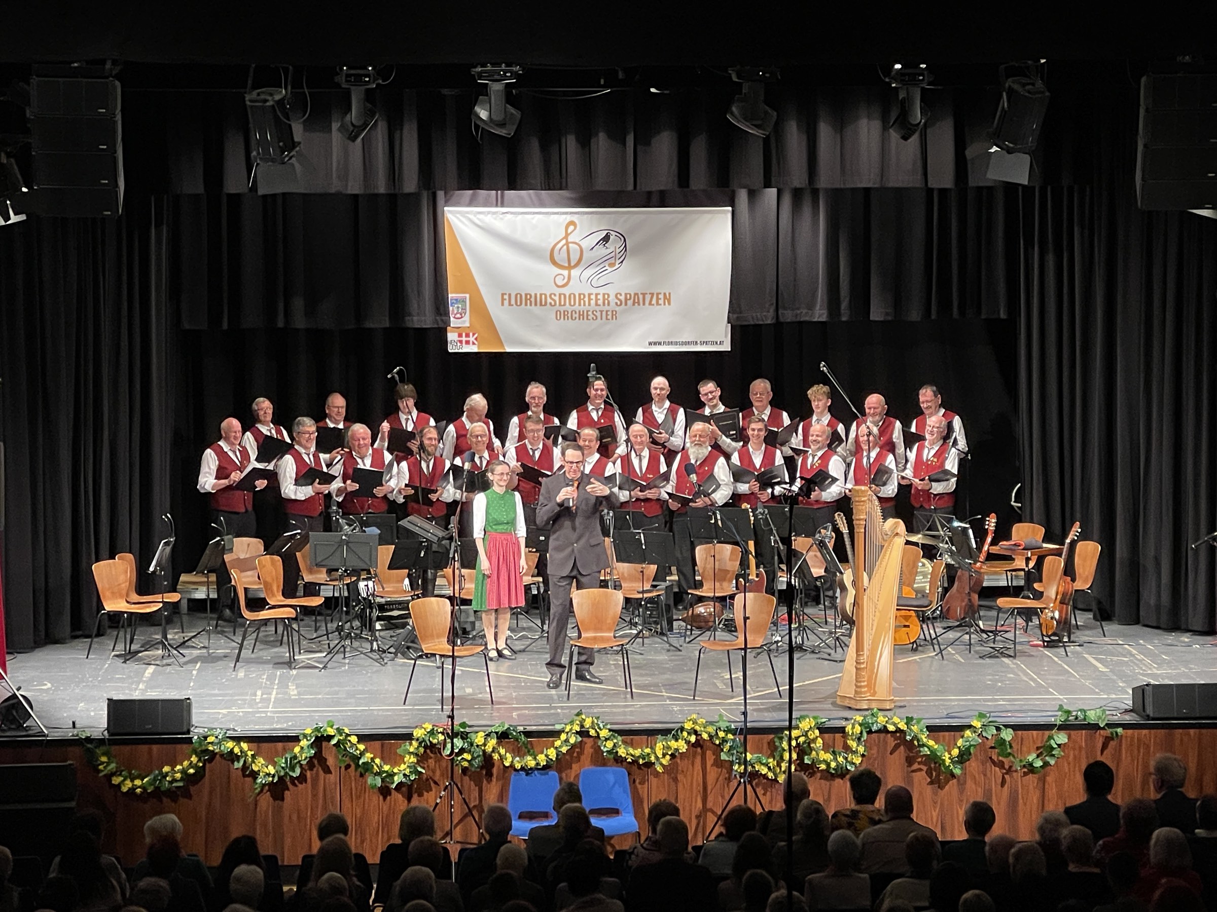 Das Frühlingserwachen nahmen die Floridsdorfer Spatzen zum Anlass, um zu ihrem Frühjahrskonzert am 30.3.2025 ins Haus der Begegnung, im 21. Bezirk, Angerer Straße 14, einzuladen. Das Konzert stand unter dem Motto „Oh du mein Österreich“ (Große Gala der Volksmusik). Als Gäste wirkten mit Stefanie Bramböck (Harfe und Gesang), die Hausmusi Reitbauer, der Gesangsverein der Steirer in Wien und der Margarethener Männerchor. Dirigent Kerem Sezen bot dem Publikum ein vielfältiges und fröhliches Programm der Volksmusik. Amüsant wie immer führte Victor Kautsch durch das Programm.
